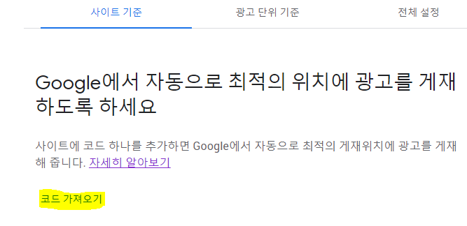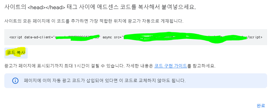 4) 애드센스 코드 복사를 눌러 사이트의 HTML편집에서 <head> </head> 태그 사이에 붙여넣기하세요.