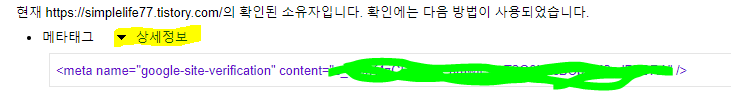 4) 메타태그 옆에 상세정보를 클릭하면 본인의 구글서치콘솔 소유권 확인코드 HTML이 나옵니다. 해당 코드를 본인의 티스토리 HTML 편집에서 <head>와 </head>사이에 붙여주시면 됩니다.