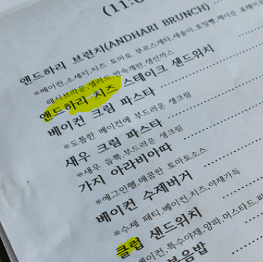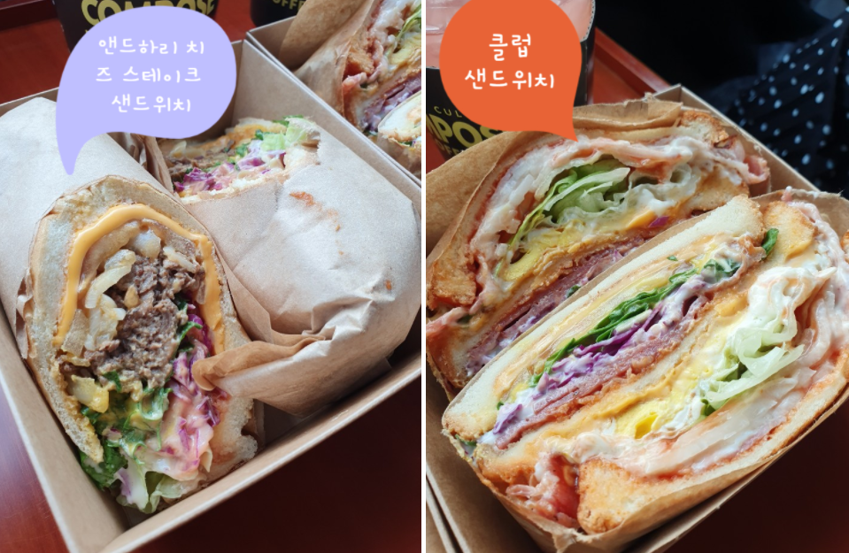 저희는 수제버거를 먹을까 아니면 브런치를 안에서 먹고 갈까 고민하다가 왓챠를 보면서 먹기에는 샌드위치기 아무래도 편할 것 같아서 앤드하리 치즈 스테이크 샌드위치랑 클럽 샌드위치를 주문했어요.