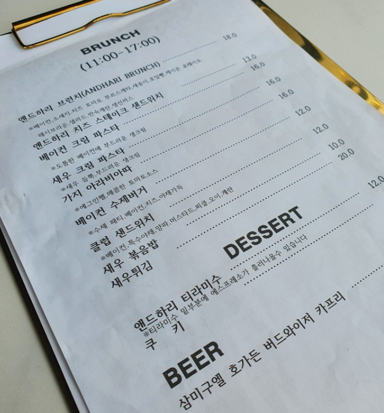 1) 가격 - 아래메뉴판을 보시면 됩니다. 브런치 가격이 가성비가 있어보입니다. 다음에 오면 저거 먹어보려구요. 그런데 BRUNCH 시간이 11:00~17:00 까지더군요. 제가 그런데 음료랑 맥주 메뉴를 찍지 않았네요.
