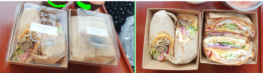 이렇게 구경하니까 주문한 샌드위치가 드디어 나왔습니다. 그래서 테이크아웃해서 동검길따라 노을뷰를 볼 수 있는 장소를 찾아 파킹하고 드디어 음식을 먹게 됩니다. 너무 배고팠어... 이렇게 깔끔하고 보기좋게 포장해주셨네요.