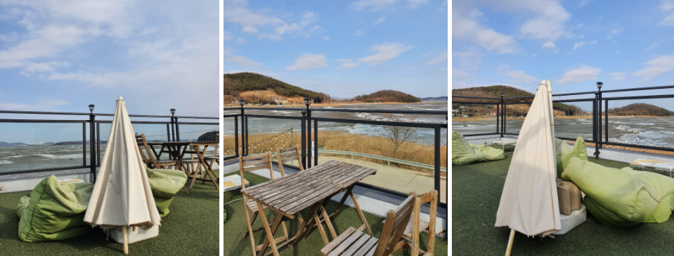 샌드위치를 기다리는 동안 야외테라스가 있다고 해서 테라스뷰를 구경했는데 코로나만 아니면 저녁까지 있다가고 싶은 뷰였어요.. 나중에 나이 먹으면 이렇게 살고싶다고도 생각을했어요. 뭔가 심심할 것 같지만요 !!