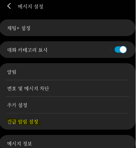 3) 메세지 설정에서 긴급 알림 설정을 눌러주세요.