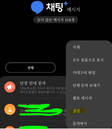 2) 메시지란의 설정을 클릭합니다.