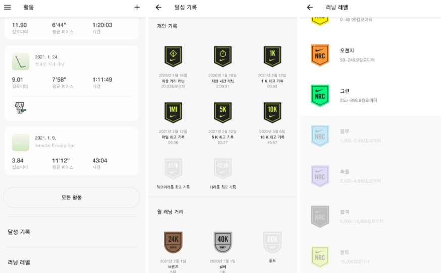 3) 활동에는 달성 기록과 러닝레벨이 나옵니다. 엠블럼도 주기때문에 성취감도 느낄 수 있어요.