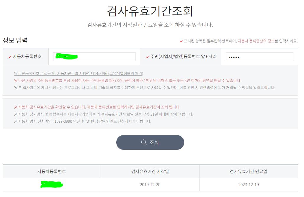 3) 정보를 입력하면 검사 유효기간 시작일과 만료일이 확인이 됩니다. 해당 기간 안에 자동차 검사를 받아야 합니다.