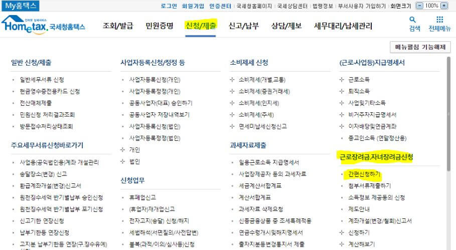 * 로그인 -> 신청/제출 -> 근로장려금 -> 간편 신청하기 순서대로 클릭해줍니다.